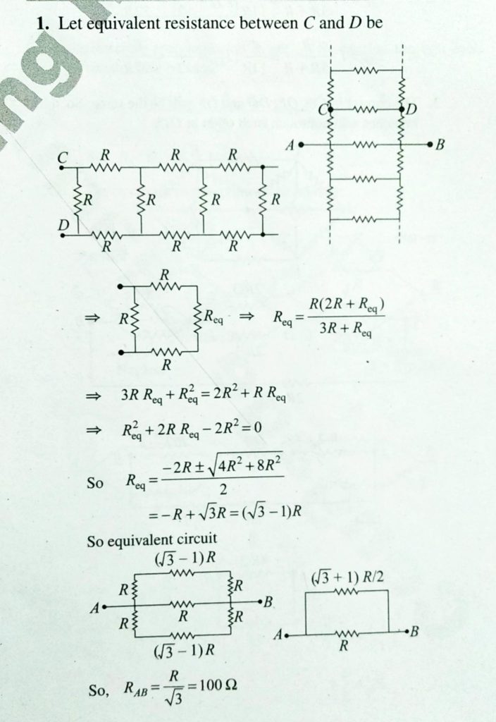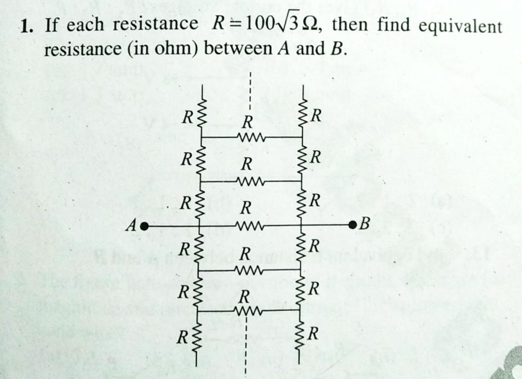 If each resistance R = 100 root 3 ohm, then find equivalent resistance ( in ohm ) between A and B. If each resistance R = 100 root 3 ohm then find equivalent resistance ( in ohm ) between A and B. September 19, 2020 Category: Uncategorised (JEE Advanced Physics by BM Sharma + GMP Solutions) , Facebook Messenger WhatsApp Share this:TwitterFacebook Related