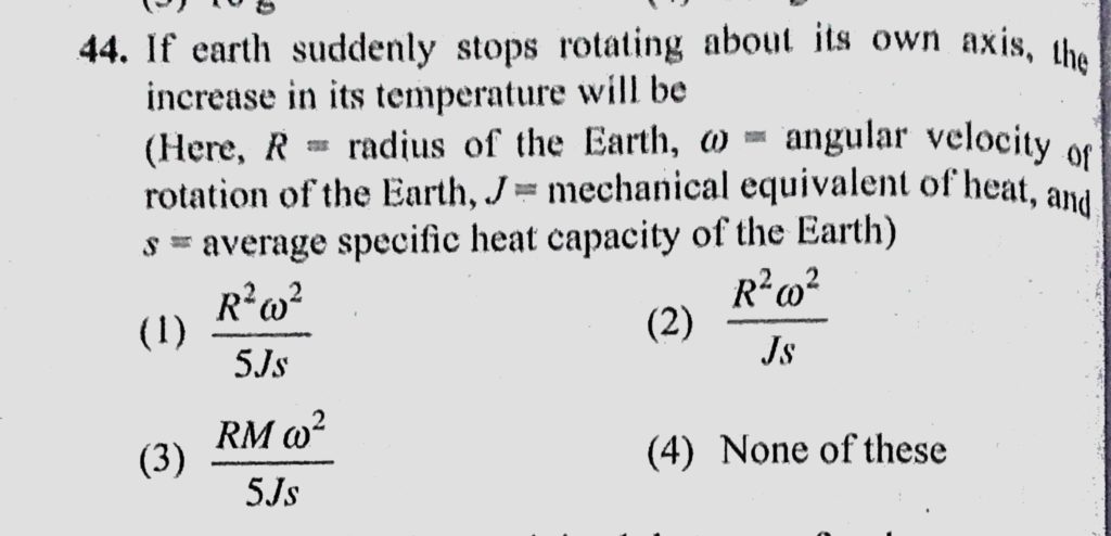 If earth suddenly stops rotating about its own axis, the increase in its temperature will be (Here, R = radius of the Earth, omega = angular velocity of rotation of the Earth, J = mechanical If earth suddenly stops rotating about its own axis J = mechanical omega = angular velocity of rotation of the Earth R = radius of the Earth the increase in its temperature will be (Here October 23, 2020 Category: Uncategorised (JEE Advanced Physics by BM Sharma + GMP Solutions) , Facebook Messenger WhatsApp Share this:TwitterFacebook Related