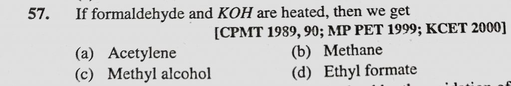 If formaldehyde and KOH are heated, then we get (a) Acetylene (b) Methane (c) Methyl alcohol (d) Ethyl formate If formaldehyde and KOH are heated then we get (a) Acetylene (b) Methane (c) Methyl alcohol (d) Ethyl formate February 11, 2021 Category: Uncategorised (JEE Advanced Physics by BM Sharma + GMP Solutions) , Facebook Messenger WhatsApp Share this:TwitterFacebook Related