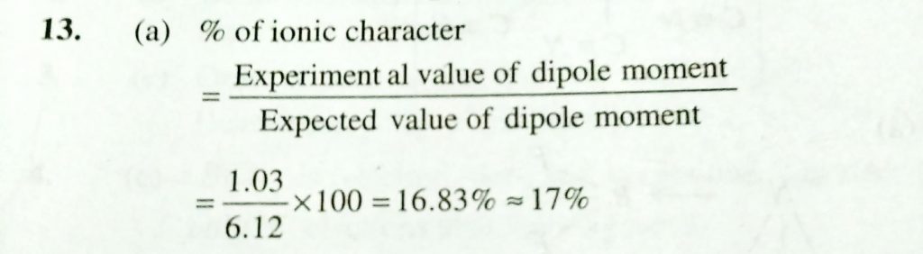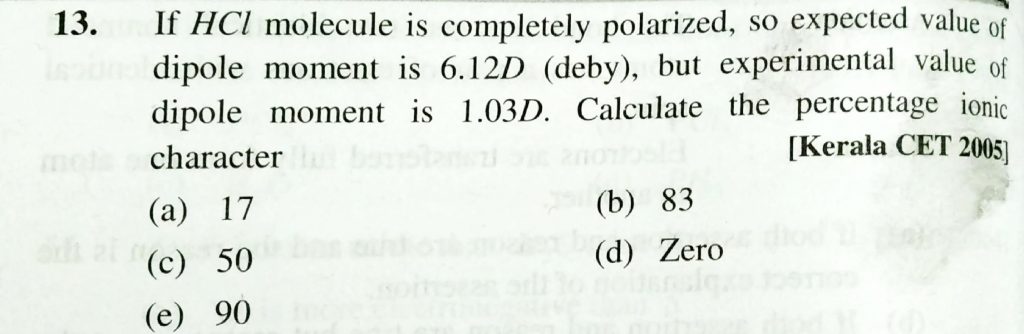 If HCL molecule is completely polarized , so expected value of dipole moment is 6.12D (deby ) , but ezperimental value of dipole moment is 1.03 D. Calculate the percentage ionic character but ezperimental value of dipole moment is 1.03 D. Calculate the percentage ionic character If HCL molecule is completely polarized so expected value of dipole moment is 6.12D (deby ) December 2, 2020 Category: Uncategorised (JEE Advanced Physics by BM Sharma + GMP Solutions) , Facebook Messenger WhatsApp Share this:TwitterFacebook Related