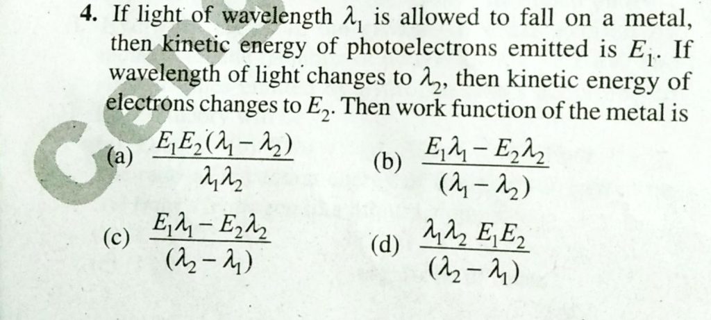 If light of wavelength λ1 is allowed to fall on a metal , then kinetic energy of photoelectrons emitted is E1. If wavelength of light changes to λ2 then kinetic energy of electrons changes to E2. Then work function of the metal is If light of wavelength λ1 is allowed to fall on a metal then kinetic energy of photoelectrons emitted is E1. If wavelength of light changes to λ2 then kinetic energy of electrons changes to E2. Then work function of the metal is September 13, 2020 Category: Uncategorised (JEE Advanced Physics by BM Sharma + GMP Solutions) , Facebook Messenger WhatsApp Share this:TwitterFacebook Related