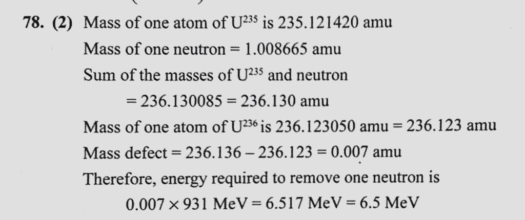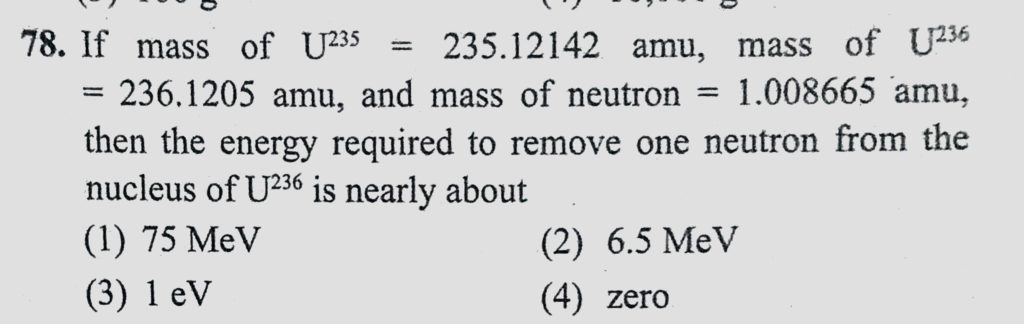 If mass of U235 = 235.12142 amu, mass of U236 = 236.1205 amu, and mass of neutron = 1.008665 amu, then the energy required to remove one neutron from the nucleus of U236 is and mass of neutron = 1.008665 amu If mass of U235 = 235.12142 amu mass of U236 = 236.1205 amu then the energy required to remove one neutron from the nucleus of U236 is October 18, 2020 Category: Uncategorised (JEE Advanced Physics by BM Sharma + GMP Solutions) , Facebook Messenger WhatsApp Share this:TwitterFacebook Related