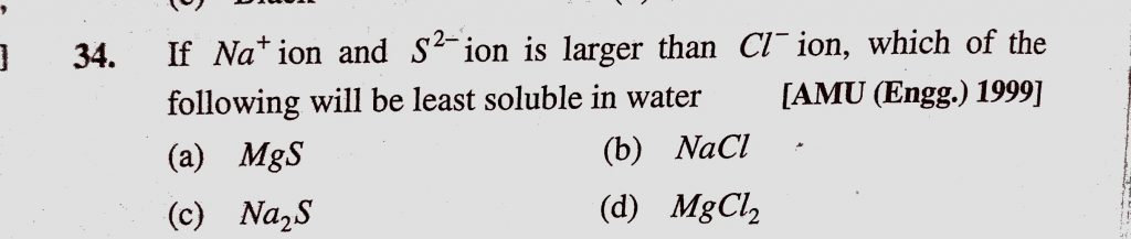 If Na+ ion and S2- ion is larger than Cl- ion, which of the following will be least soluble in water (a) MgS (b) NaCl (c) Na2S (d) MgCl2 If Na+ ion and S2- ion is larger than Cl- ion which of the following will be least soluble in water (a) MgS (b) NaCl (c) Na2S (d) MgCl2 December 6, 2020 Category: Uncategorised (JEE Advanced Physics by BM Sharma + GMP Solutions) , Facebook Messenger WhatsApp Share this:TwitterFacebook Related