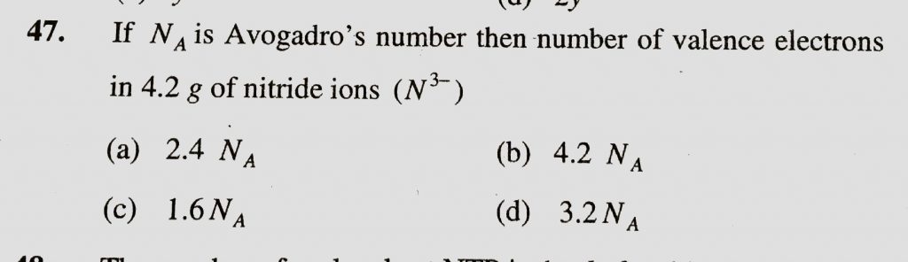 If Na is Avogadro’s number then number of valence electrons in 4.2 g of nitride ions (N^3- ) If Na is Avogadro's number then number of valence electrons in 4.2 g of nitride ions (N^3- ) November 22, 2020 Category: Uncategorised (JEE Advanced Physics by BM Sharma + GMP Solutions) , Facebook Messenger WhatsApp Share this:TwitterFacebook Related