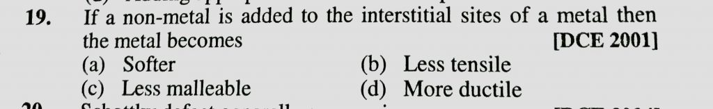 If non- metal is added to the interstitial sites of a metal then the metal becomes (a) Softer (b) Less tensile (c) Less malleable (d) More ductile If non- metal is added to the interstitial sites of a metal then the metal becomes (a) Softer (b) Less tensile (c) Less malleable (d) More ductile February 9, 2021 Category: Uncategorised (JEE Advanced Physics by BM Sharma + GMP Solutions) , Facebook Messenger WhatsApp Share this:TwitterFacebook Related