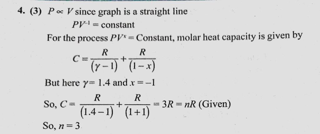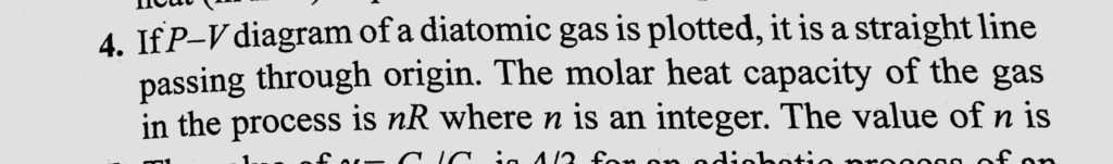 If P-V diagram of a diatomic gas is plotted, it is a straight line passing through origin. The molar heat capacity of the gas in the process is nR where n is an integer. The value of n is If P-V diagram of a diatomic gas is plotted it is a straight line passing through origin. The molar heat capacity of the gas in the process is nR where n is an integer. The value of n is October 29, 2020 Category: Uncategorised (JEE Advanced Physics by BM Sharma + GMP Solutions) , Facebook Messenger WhatsApp Share this:TwitterFacebook Related