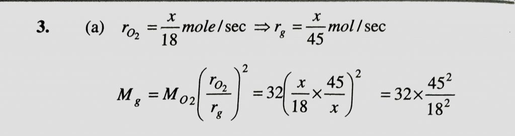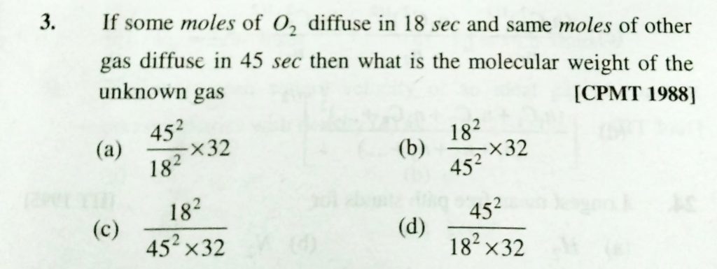 If some moles of O2 diffuse in 18 sec and same moles of an unknown gas diffuse in 45 sec then what is the molecular weight of the unknown gas If some moles of O2 diffuse in 18 sec and same moles of an unknown gas diffuse in 45 sec then what is the molecular weight of the unknown gas February 12, 2021 Category: Uncategorised (JEE Advanced Physics by BM Sharma + GMP Solutions) , Facebook Messenger WhatsApp Share this:TwitterFacebook Related