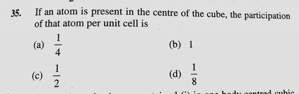 If the atom is present in the centre of the cube , the participation of that atom per unit cell is (a) 1/4 (b) 1 (c) 1/2 (d) 1/8 If the atom is present in the centre of the cube the participation of that atom per unit cell is (a) 1/4 (b) 1 (c) 1/2 (d) 1/8 December 17, 2020 Category: Uncategorised (JEE Advanced Physics by BM Sharma + GMP Solutions) , Facebook Messenger WhatsApp Share this:TwitterFacebook Related