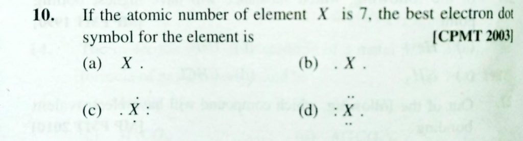If the atomic number of element X is 7 , the best electron dot symbol for the element is If the atomic number of element X is 7 the best electron dot symbol for the element is December 1, 2020 Category: Uncategorised (JEE Advanced Physics by BM Sharma + GMP Solutions) , Facebook Messenger WhatsApp Share this:TwitterFacebook Related