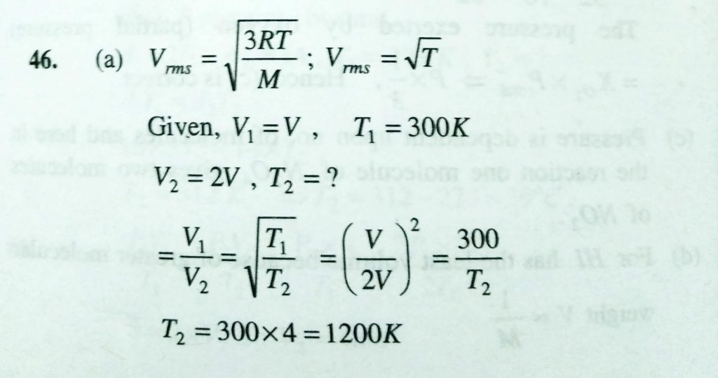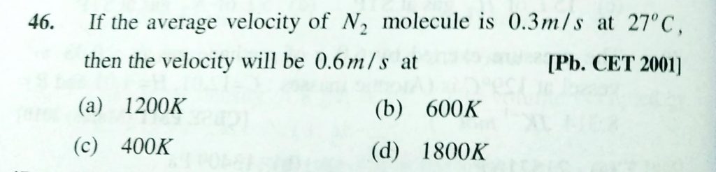 If the average velocity of N2 molecule is 0.3 m/s at 27 degree C, then the velocity will be 0.6 m/s at (a) 1200 K (b) 600 k (c) 400 k (d) 1800 k If the average velocity of N2 molecule is 0.3 m/s at 27 degree C then the velocity will be 0.6 m/s at (a) 1200 K (b) 600 k (c) 400 k (d) 1800 k February 10, 2021 Category: Uncategorised (JEE Advanced Physics by BM Sharma + GMP Solutions) , Facebook Messenger WhatsApp Share this:TwitterFacebook Related