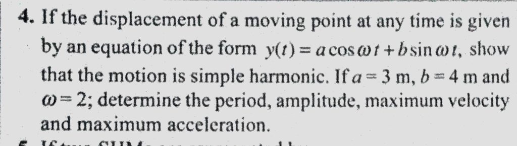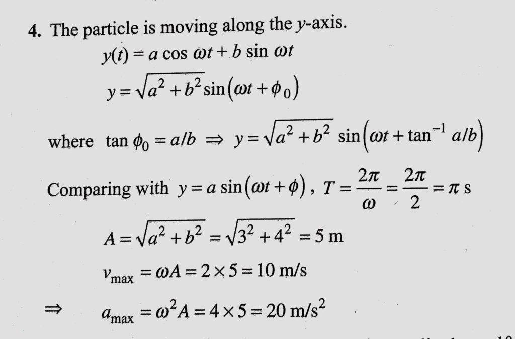 If the displacement of a moving point at any time is given by an equation of the form y(t) = a cos omega t + b sin omega t, show that the motion is simple harmonic. If a = 3 m If the displacement of a moving point at any time is given by an equation of the form y(t) = a cos omega t + b sin omega t show that the motion is simple harmonic. If a = 3 m October 30, 2020 Category: Uncategorised (JEE Advanced Physics by BM Sharma + GMP Solutions) , Facebook Messenger WhatsApp Share this:TwitterFacebook Related