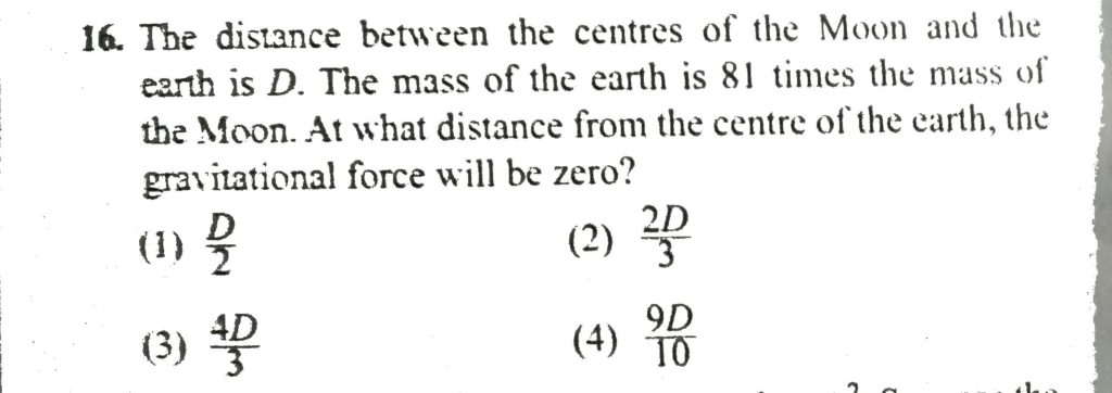 If the distance between centres of the earth and the moon is d and the mass of the earth is 81 times the mass of the moon, then at what distance from centre of the earth, the gravitational field will be zero? If the distance between centres of the earth and the moon is d and the mass of the earth is 81 times the mass of the moon the gravitational field will be zero? then at what distance from centre of the earth October 3, 2020 Category: Uncategorised (JEE Advanced Physics by BM Sharma + GMP Solutions) , Facebook Messenger WhatsApp Share this:TwitterFacebook Related