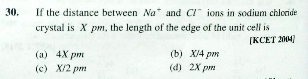 If the distance between Na^+ and Cl^- ions in sodium chloride crystal is X pm, the length of the edge of the unit cell is If the distance between Na^+ and Cl^- ions in sodium chloride crystal is X pm the length of the edge of the unit cell is December 17, 2020 Category: Uncategorised (JEE Advanced Physics by BM Sharma + GMP Solutions) , Facebook Messenger WhatsApp Share this:TwitterFacebook Related