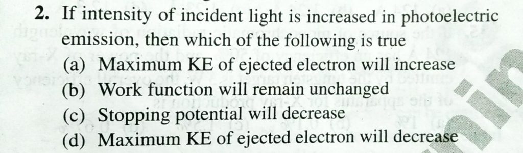 If the intensity of incident light is increased in photoelectric emission, then which of the following is true If the intensity of incident light is increased in photoelectric emission then which of the following is true September 13, 2020 Category: Uncategorised (JEE Advanced Physics by BM Sharma + GMP Solutions) , Facebook Messenger WhatsApp Share this:TwitterFacebook Related