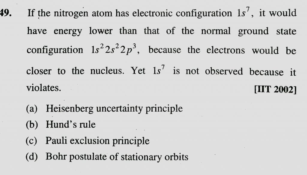 If the nitrogen atom had electronic configuration 1S 7 , it would have enrgy lower than that of the normal ground state configuration 1s 2 ,2s 2 ,2p 3 , because the electrons would be closer to the nucleus. Yet 1s 7 is not observed because it violates.