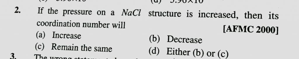 If the pressure on a NaCl structure is increased , then its coordintaion number will (a) Increase (b) Decrease (c) Remain the same (d) Either (b) or (c) If the pressure on a NaCl structure is increased then its coordintaion number will (a) Increase (b) Decrease (c) Remain the same (d) Either (b) or (c) December 17, 2020 Category: Uncategorised (JEE Advanced Physics by BM Sharma + GMP Solutions) , Facebook Messenger WhatsApp Share this:TwitterFacebook Related