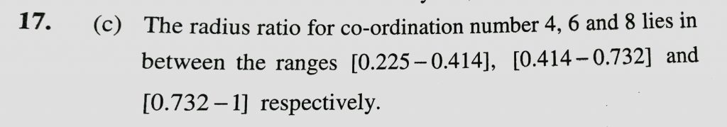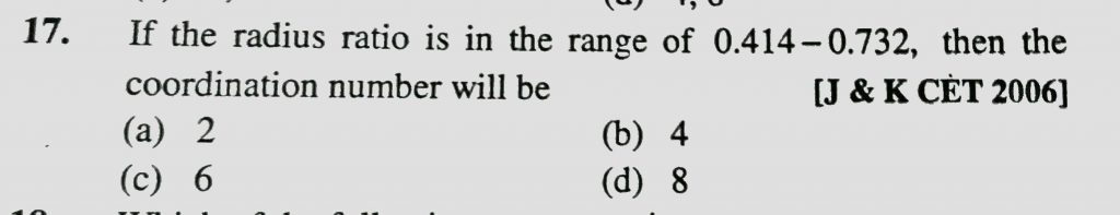 If the radius ratio is in the range of 0.414 – 0.732, then the coordintaion number will be (a) 2 (b) 4 (c) 6 (d) 8 If the radius ratio is in the range of 0.414 - 0.732 then the coordintaion number will be (a) 2 (b) 4 (c) 6 (d) 8 December 17, 2020 Category: Uncategorised (JEE Advanced Physics by BM Sharma + GMP Solutions) , Facebook Messenger WhatsApp Share this:TwitterFacebook Related