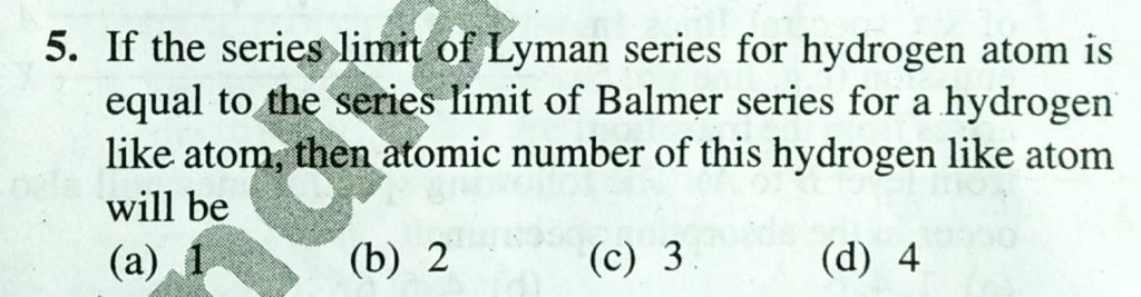 If the series limit of Lyman series for hydrogen atom is equal to the series limit of Balmer series for a hydrogen like atom, then atomic number of this hydrogen like atom will be If the series limit of Lyman series for hydrogen atom is equal to the series limit of Balmer series for a hydrogen like atom then atomic number of this hydrogen like atom will be September 14, 2020 Category: Uncategorised (JEE Advanced Physics by BM Sharma + GMP Solutions) , Facebook Messenger WhatsApp Share this:TwitterFacebook Related