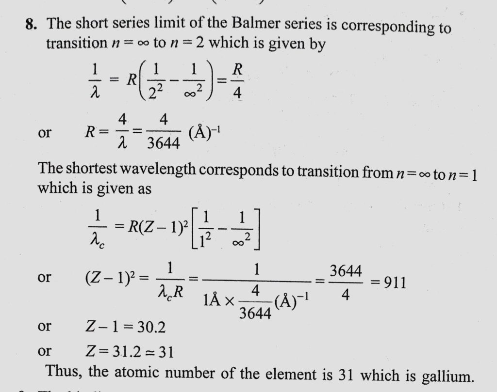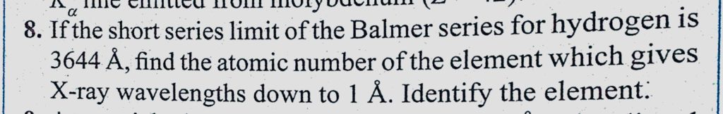 If the short series limit of the Balmer series for hydrogen is 3644 A, find the atomic number of the element which gives X-ray wavelength down to 1 A. Identify the element. find the atomic number of the element which gives X-ray wavelength down to 1 A. Identify the element. If the short series limit of the Balmer series for hydrogen is 3644 A October 15, 2020 Category: Uncategorised (JEE Advanced Physics by BM Sharma + GMP Solutions) , Facebook Messenger WhatsApp Share this:TwitterFacebook Related