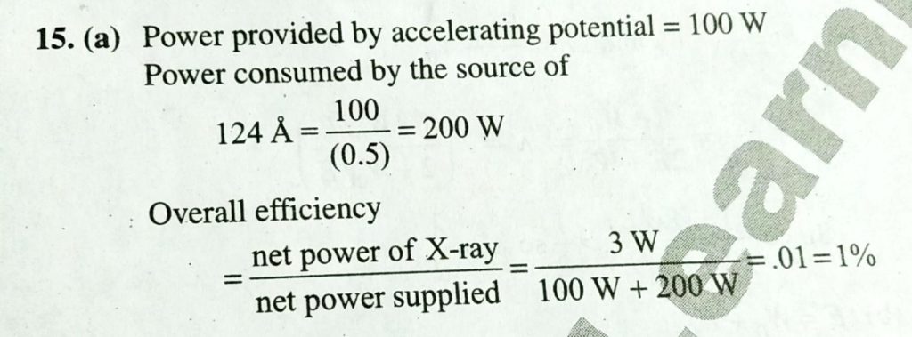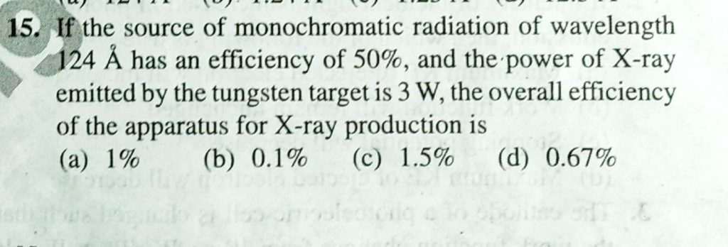 If the source of monochromatic radiation of wavelength 124 Å has an efficiency of 50% , and the power of X ray emitted by the tungsten target is 3 W , the overall efficiency of the apparatus for X−ray production is and the power of X ray emitted by the tungsten target is 3 W If the source of monochromatic radiation of wavelength 124 Å has an efficiency of 50% the overall efficiency of the apparatus for X−ray production is September 13, 2020 Category: Uncategorised (JEE Advanced Physics by BM Sharma + GMP Solutions) , Facebook Messenger WhatsApp Share this:TwitterFacebook Related