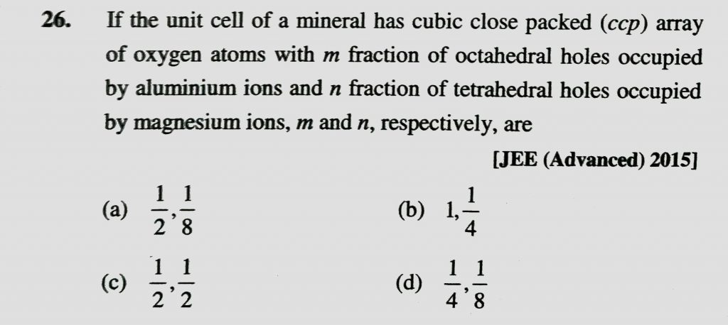If the unit cel.l of a mineral has cubioc closed packed (ccp) array of oxygen atoms with m fraction of octahedral holes occupied by aluminium ions and n fraction of tetrahedral holes occupied by magnesium ions, m and n , respectively , are The packing efficiency of the two dimensional square unit cell shown below is (a) 39.27% (b) 68.02% (c) 74.05% (d) 78.54% February 9, 2021 Category: Uncategorised (JEE Advanced Physics by BM Sharma + GMP Solutions) , Facebook Messenger WhatsApp Share this:TwitterFacebook Related
