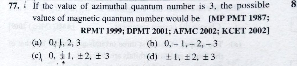 If the value of azimuthal quantum number is 3, the possible values of magnetic quantum number would be If the value of azimuthal quantum number is 3 the possible values of magnetic quantum number would be November 28, 2020 Category: Uncategorised (JEE Advanced Physics by BM Sharma + GMP Solutions) , Facebook Messenger WhatsApp Share this:TwitterFacebook Related