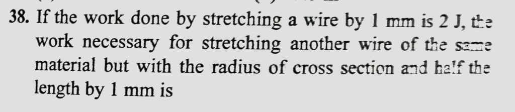 If the work done in stretching a wire by 1 mm is 2 J, then work necessary for stretching another wire of same material but with double radius of cross -section and half of the length by 1 mm is If the work done in stretching a wire by 1 mm is 2 J then work necessary for stretching another wire of same material but with double radius of cross -section and half of the length by 1 mm is October 10, 2020 Category: Uncategorised (JEE Advanced Physics by BM Sharma + GMP Solutions) , Facebook Messenger WhatsApp Share this:TwitterFacebook Related