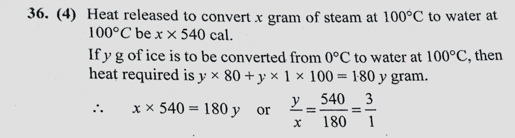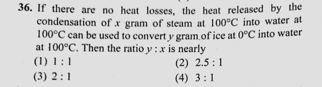 If there are no heat loses, the heat released by the condensation of x gram of steam at 100 C into water at 100 C can be used to convert y gram of ice at 0 c into water at 100 C. If there are no heat loses the heat released by the condensation of x gram of steam at 100 C into water at 100 C can be used to convert y gram of ice at 0 c into water at 100 C. October 23, 2020 Category: Uncategorised (JEE Advanced Physics by BM Sharma + GMP Solutions) , Facebook Messenger WhatsApp Share this:TwitterFacebook Related