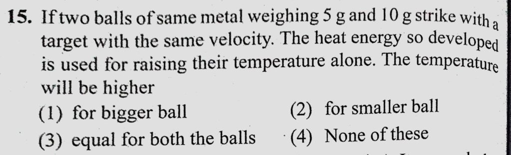 If two balls of same metal weighing 5 g and 10 g strike with a target with the same velocity. The heat energy so developed is used for raising their temperature alone. The temperature If two balls of same metal weighing 5 g and 10 g strike with a target with the same velocity. The heat energy so developed is used for raising their temperature alone. The temperature October 23, 2020 Category: Uncategorised (JEE Advanced Physics by BM Sharma + GMP Solutions) , Facebook Messenger WhatsApp Share this:TwitterFacebook Related