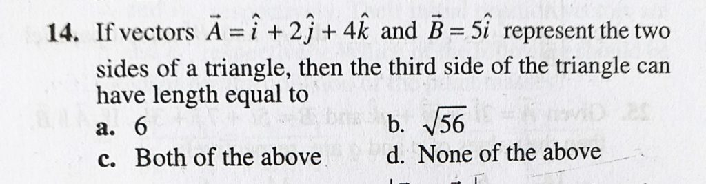 If vectors A = i + 2j + 4k and B = 5i represents the two sides of a triangle, then the third side of the triangle can have length equal to If vectors A = i + 2j + 4k and B = 5i represents the two sides of a triangle then the third side of the triangle can have length equal to September 17, 2020 Category: Uncategorised (JEE Advanced Physics by BM Sharma + GMP Solutions) , Facebook Messenger WhatsApp Share this:TwitterFacebook Related