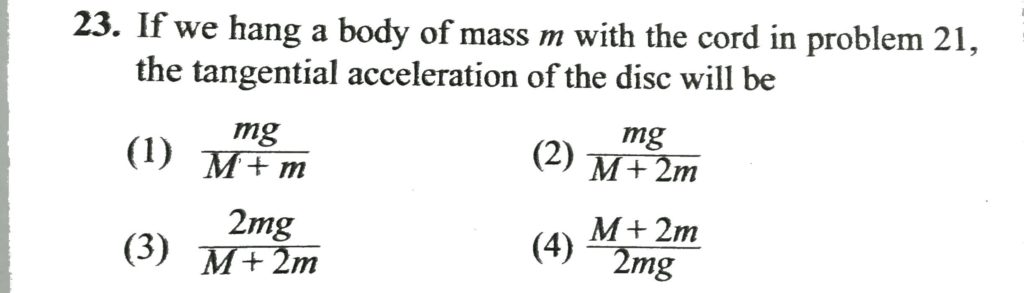 If we hang a body of mass m with the cord in problem 21, the tangential acceleration of the disc will be If we hang a body of mass m with the cord in problem 21 the tangential acceleration of the disc will be September 26, 2020 Category: Uncategorised (JEE Advanced Physics by BM Sharma + GMP Solutions) , Facebook Messenger WhatsApp Share this:TwitterFacebook Related