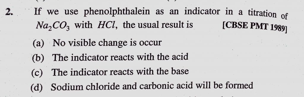 If we use phenolphthalein as an indicator in a titration of Na2CO3 with HCl, the usual result is (a) No visible change is occur If we use phenolphthalein as an indicator in a titration of Na2CO3 with HCl the usual result is (a) No visible change is occur December 7, 2020 Category: Uncategorised (JEE Advanced Physics by BM Sharma + GMP Solutions) , Facebook Messenger WhatsApp Share this:TwitterFacebook Related