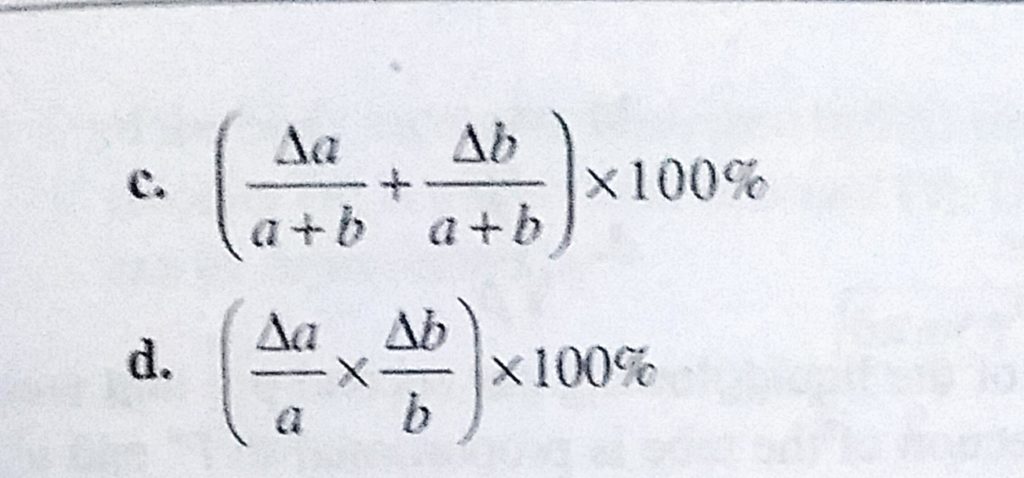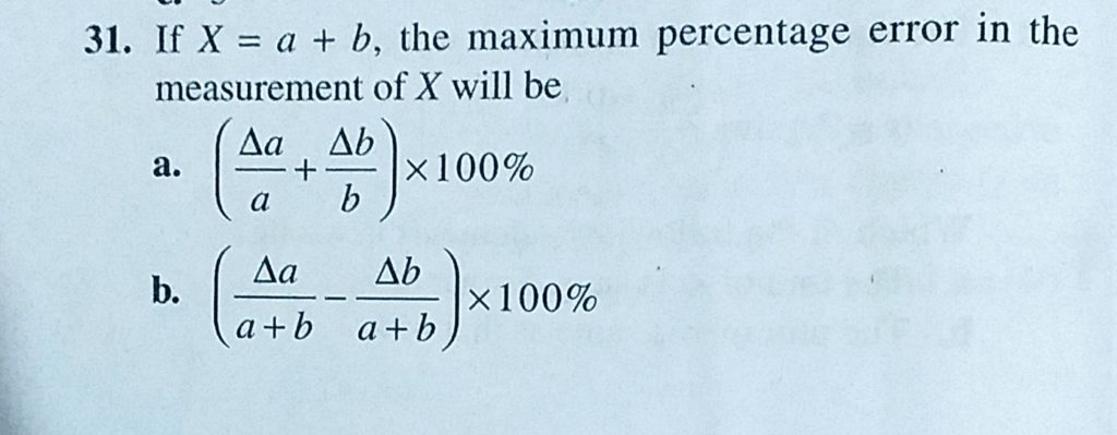 If X = a + b, the maximum percentage error in the measurement of X will be If X = a + b the maximum percentage error in the measurement of X will be September 15, 2020 Category: Uncategorised (JEE Advanced Physics by BM Sharma + GMP Solutions) , Facebook Messenger WhatsApp Share this:TwitterFacebook Related