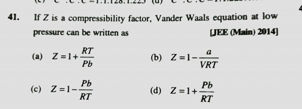 If Z is a compressibility factor , Vander Waal’s equation at low pressure can be written as If Z is a compressibility factor Vander Waal's equation at low pressure can be written as February 12, 2021 Category: Uncategorised (JEE Advanced Physics by BM Sharma + GMP Solutions) , Facebook Messenger WhatsApp Share this:TwitterFacebook Related