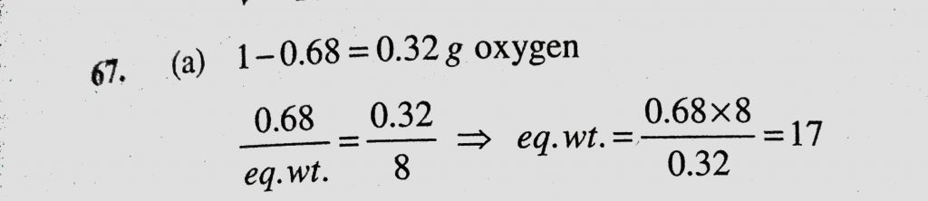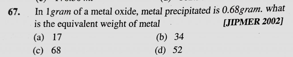 In 1 gram of a metal oxide, metal precipitated is 0.68 gram. What is the equivalent weight of metal In 1 gram of a metal oxide metal precipitated is 0.68 gram. What is the equivalent weight of metal December 7, 2020 Category: Uncategorised (JEE Advanced Physics by BM Sharma + GMP Solutions) , Facebook Messenger WhatsApp Share this:TwitterFacebook Related