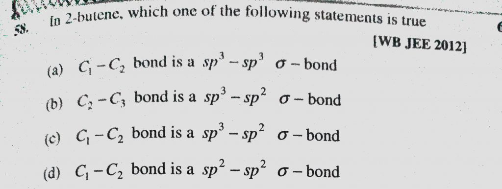 In 2-butene, which one of the following statements is true (a) C1-C2 bond is a sp3-sp3 sigma bond In 2-butene which one of the following statements is true (a) C1-C2 bond is a sp3-sp3 sigma bond December 8, 2020 Category: Uncategorised (JEE Advanced Physics by BM Sharma + GMP Solutions) , Facebook Messenger WhatsApp Share this:TwitterFacebook Related