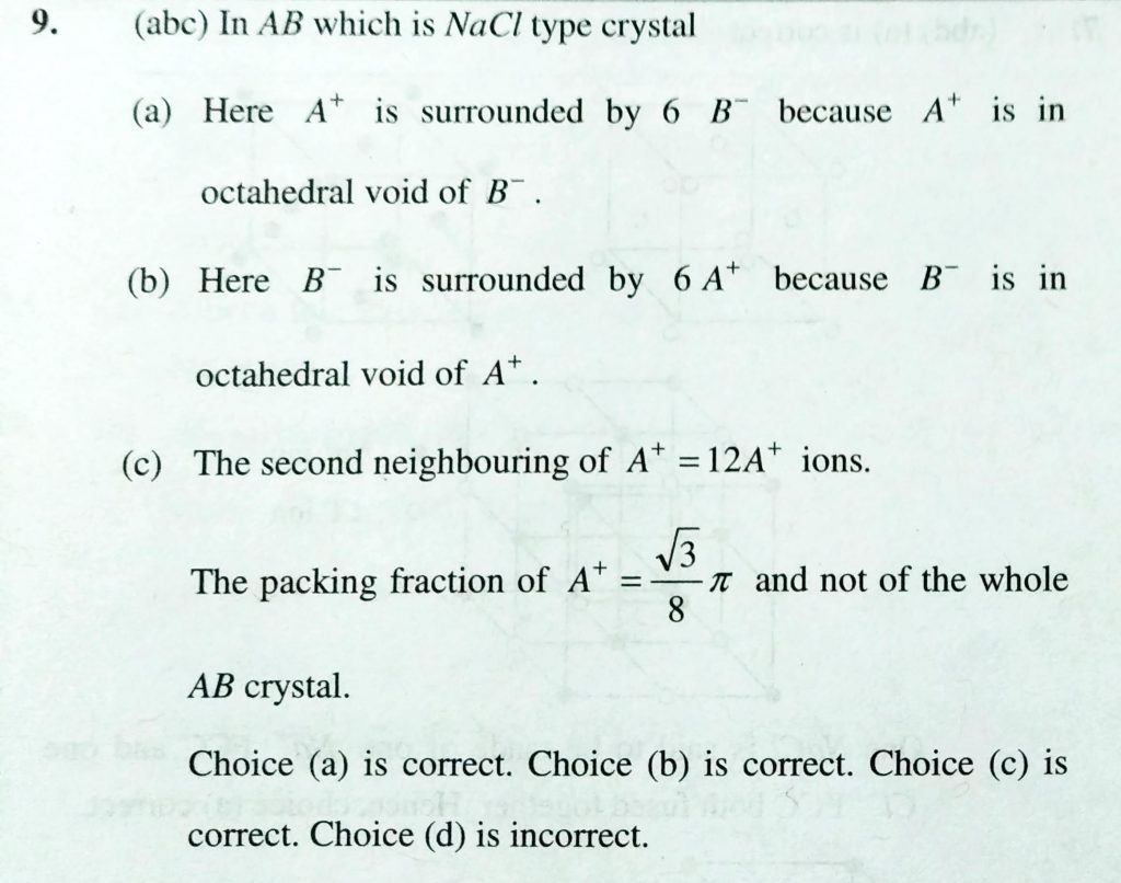 In a AB unit crystal of NaCl types assuming Na^+ forming Fcc (a) The nearest neighbour of A^+ is 6 B^- ion (b) The nearest neighbour of B^- is 6A^+ ion (c) The second neighbour of A^+ is 12 A^+ In a AB unit crystal of NaCl types assuming Na^+ forming Fcc (a) The nearest neighbour of A^+ is 6 B^- ion (b) The nearest neighbour of B^- is 6A^+ ion (c) The second neighbour of A^+ is 12 A^+ February 10, 2021 Category: Uncategorised (JEE Advanced Physics by BM Sharma + GMP Solutions) , Facebook Messenger WhatsApp Share this:TwitterFacebook Related