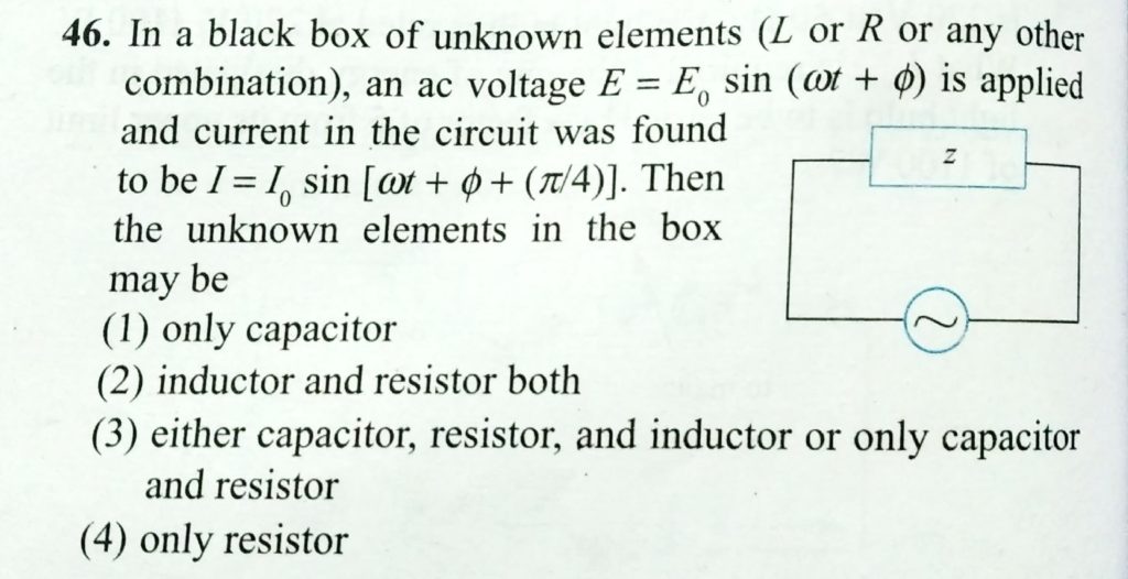 In a black box of unknown elements (L or R or any other combination), an ac voltage E=E 0 sin(ωt+ϕ) is applied and current in the circuit was found to be I = I 0 sin[ ωt+ϕ+(π/4) ]. Then the unknown elements in the box may be an ac voltage E=E 0 sin(ωt+ϕ) is applied and current in the circuit was found to be I = I 0 sin[ ωt+ϕ+(π/4) ]. Then the unknown elements in the box may be In a black box of unknown elements (L or R or any other combination) October 27, 2020 Category: Uncategorised (JEE Advanced Physics by BM Sharma + GMP Solutions) , Facebook Messenger WhatsApp Share this:TwitterFacebook Related
