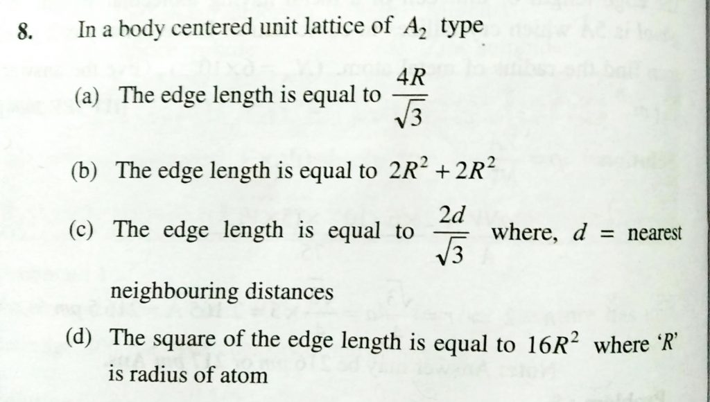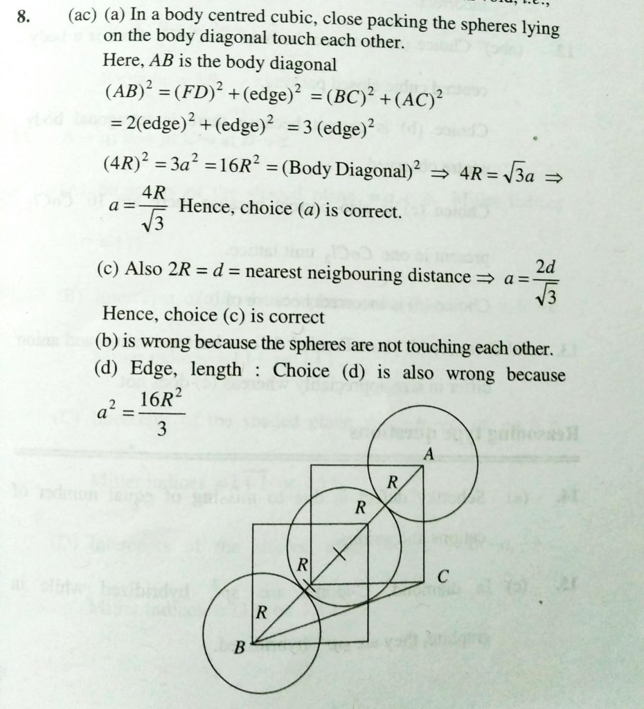 In a body centred unit lattice of A2 type (a) The edge length is equal to 4R/root 3 (b) The edge length is equal to 2R^2 + 2R^2 (c) The edge length is equal to 2d/root 3 where, d = nearest neighbouring distances d = nearest neighbouring distances In a body centred unit lattice of A2 type (a) The edge length is equal to 4R/root 3 (b) The edge length is equal to 2R^2 + 2R^2 (c) The edge length is equal to 2d/root 3 where February 10, 2021 Category: Uncategorised (JEE Advanced Physics by BM Sharma + GMP Solutions) , Facebook Messenger WhatsApp Share this:TwitterFacebook Related