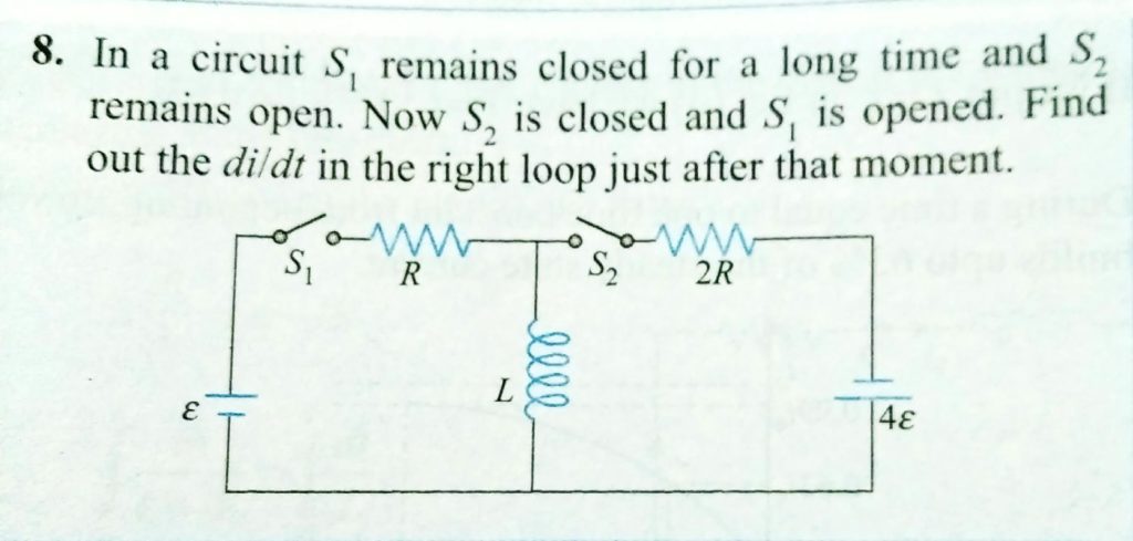 In a circuit S1 remains closed for a long time and s2 re,mains open. Now s2 is closed and s1 is opened. Find out the di/dt in the right loop just after that moment. In a circuit S1 remains closed for a long time and s2 re mains open. Now s2 is closed and s1 is opened. Find out the di/dt in the right loop just after that moment. October 21, 2020 Category: Uncategorised (JEE Advanced Physics by BM Sharma + GMP Solutions) , Facebook Messenger WhatsApp Share this:TwitterFacebook Related