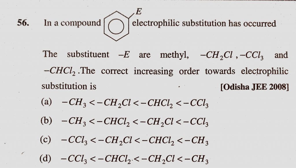 In a compound electrophilic substitution has occured The substituent -E are methyl, -CH2Cl, -CCl3 and -CHCl2. The correct increasing order towards electrophilic substitution is -CCl3 and -CHCl2. The correct increasing order towards electrophilic substitution is -CH2Cl In a compound electrophilic substitution has occured The substituent -E are methyl December 9, 2020 Category: Uncategorised (JEE Advanced Physics by BM Sharma + GMP Solutions) , Facebook Messenger WhatsApp Share this:TwitterFacebook Related