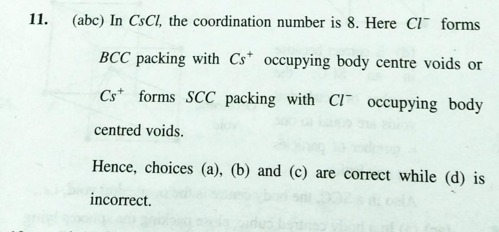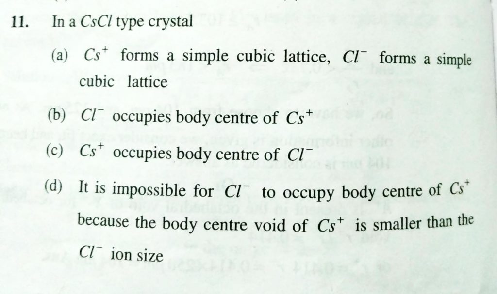 In a CsCl type crystal (a) Cs^+ forms a simple cubic lattice , Cl^- forms a simple cubic lattice (b) Cl^- occupies body centre of Cs^+ (c) Cs^+ occupies body centre of Cl^- Cl^- forms a simple cubic lattice (b) Cl^- occupies body centre of Cs^+ (c) Cs^+ occupies body centre of Cl^- In a CsCl type crystal (a) Cs^+ forms a simple cubic lattice February 10, 2021 Category: Uncategorised (JEE Advanced Physics by BM Sharma + GMP Solutions) , Facebook Messenger WhatsApp Share this:TwitterFacebook Related