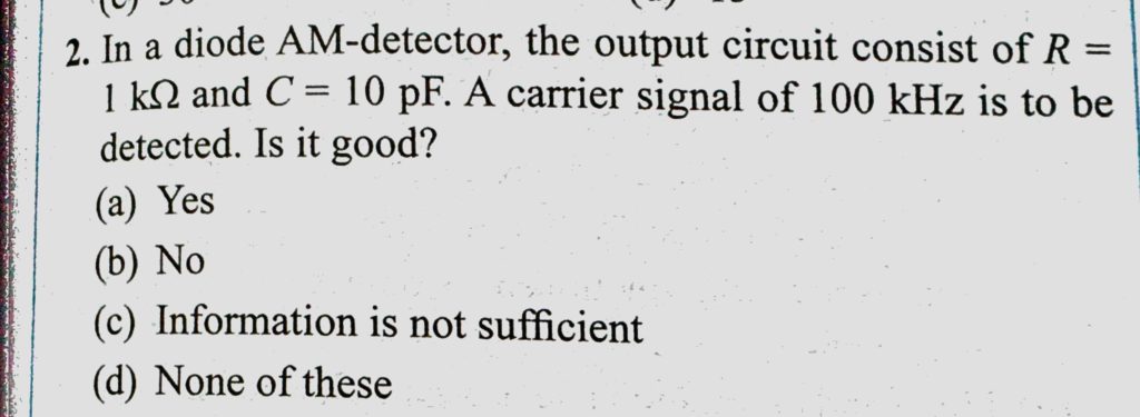 In a diode AM-detector, the output circuit consist of R = 1 k ohm and C = 10 pF. A carrier signal of 100 kHz is to be detected. Is it good ? In a diode AM-detector the output circuit consist of R = 1 k ohm and C = 10 pF. A carrier signal of 100 kHz is to be detected. Is it good ? October 22, 2020 Category: Uncategorised (JEE Advanced Physics by BM Sharma + GMP Solutions) , Facebook Messenger WhatsApp Share this:TwitterFacebook Related