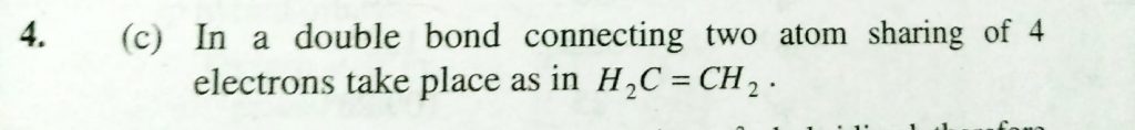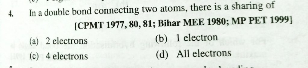 In a double bond connecting two atoms , there is a sharing of (a) 2 electrons (b) 1 electrons (c) 4 electrons (d) all electrons In a double bond connecting two atoms there is a sharing of (a) 2 electrons (b) 1 electrons (c) 4 electrons (d) all electrons December 2, 2020 Category: Uncategorised (JEE Advanced Physics by BM Sharma + GMP Solutions) , Facebook Messenger WhatsApp Share this:TwitterFacebook Related