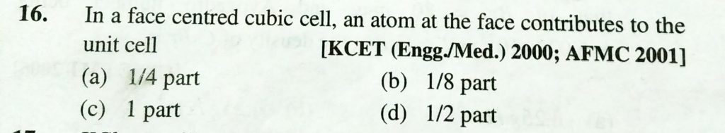 In a face centred cubic cell , an atom at the face contributes to the unit cell (a) 1/4 part (b) 1/8 part (c) 1 part (d) 1/2 part an atom at the face contributes to the unit cell (a) 1/4 part (b) 1/8 part (c) 1 part (d) 1/2 part In a face centred cubic cell February 8, 2021 Category: Uncategorised (JEE Advanced Physics by BM Sharma + GMP Solutions) , Facebook Messenger WhatsApp Share this:TwitterFacebook Related