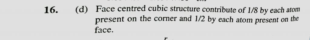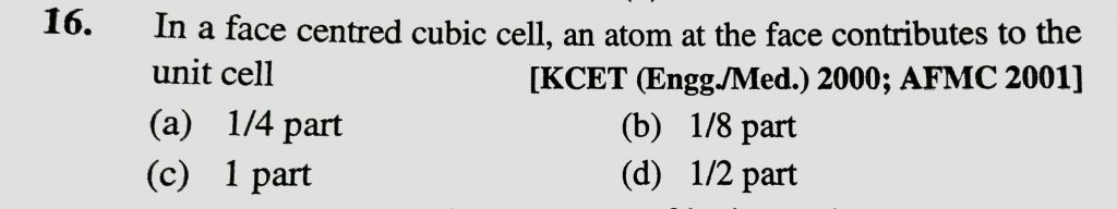 In a face centredcubic cell, an atom at the face contributes to the unit cell (a) 1/4 part (b) 1/8 part (c) 1 part (d) 1/2 part an atom at the face contributes to the unit cell (a) 1/4 part (b) 1/8 part (c) 1 part (d) 1/2 part In a face centredcubic cell December 16, 2020 Category: Uncategorised (JEE Advanced Physics by BM Sharma + GMP Solutions) , Facebook Messenger WhatsApp Share this:TwitterFacebook Related