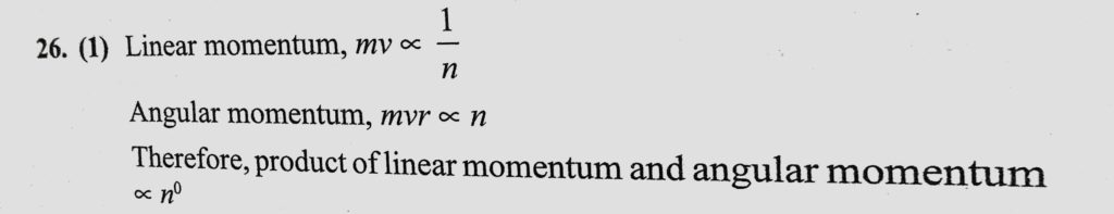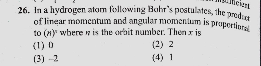 In a hydrogen atom following Bohr’s postulates, the product of linear momentum and angular momentum is proportional to (n) ^x where n is the orbit number. Then x is In a hydrogen atom following Bohr's postulates the product of linear momentum and angular momentum is proportional to (n) ^x where n is the orbit number. Then x is October 15, 2020 Category: Uncategorised (JEE Advanced Physics by BM Sharma + GMP Solutions) , Facebook Messenger WhatsApp Share this:TwitterFacebook Related