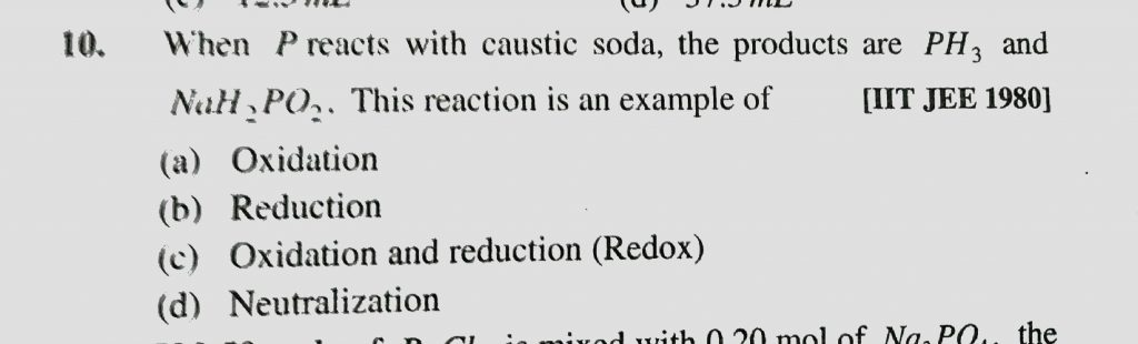 When P reacts with caustic soda, the products are PH3 and NaH2PO2. This reaction is an example of the products are PH3 and NaH2PO2. This reaction is an example of When P reacts with caustic soda November 24, 2020 Category: Uncategorised (JEE Advanced Physics by BM Sharma + GMP Solutions) , Facebook Messenger WhatsApp Share this:TwitterFacebook Related