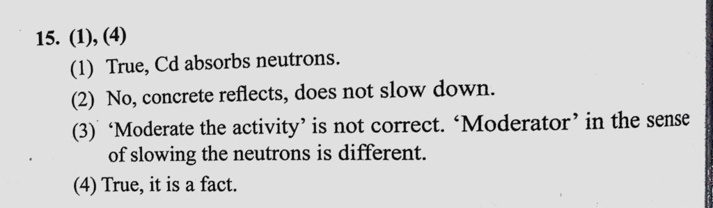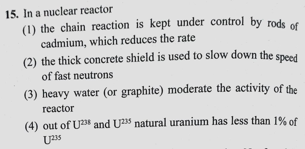 In a nuclear reactor (1) the chain reaction is kept under control by rods of cadmium, which reduces the rate (2) the thick concrete shield is used to slow down the speed of fast neutrons In a nuclear reactor (1) the chain reaction is kept under control by rods of cadmium which reduces the rate (2) the thick concrete shield is used to slow down the speed of fast neutrons October 18, 2020 Category: Uncategorised (JEE Advanced Physics by BM Sharma + GMP Solutions) , Facebook Messenger WhatsApp Share this:TwitterFacebook Related