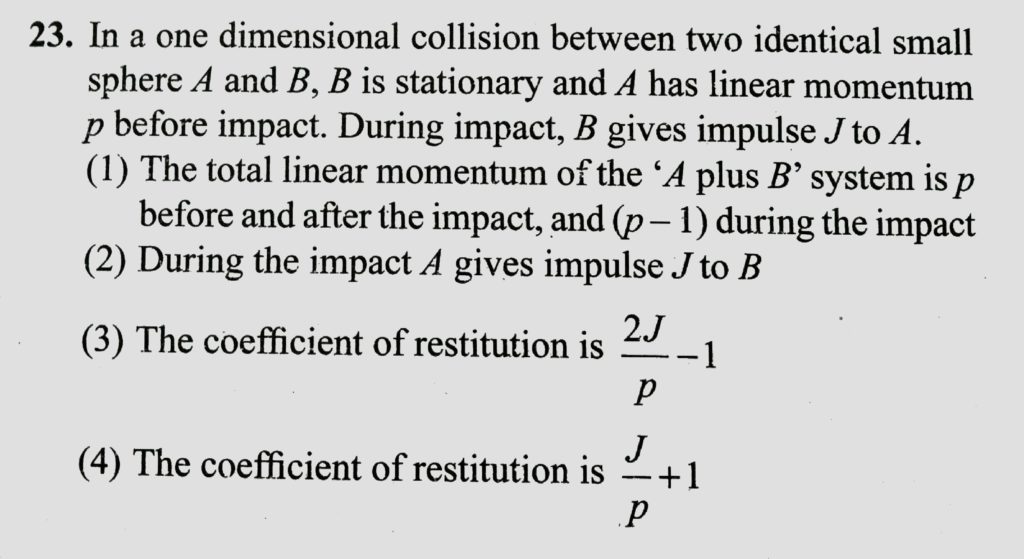 In a one dimensional collision between two identical particles A and B, B is stationary and A has momentum p before impact. During impact, B given J to A. B given J to A. B is stationary and A has momentum p before impact. During impact In a one dimensional collision between two identical particles A and B September 24, 2020 Category: Uncategorised (JEE Advanced Physics by BM Sharma + GMP Solutions) , Facebook Messenger WhatsApp Share this:TwitterFacebook Related
